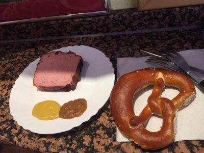 左の皿にはレーバーケーゼが乗っている。添えられているのは辛子。レーバーケーゼはミートローフみたいなもんだけど、日本の人がふつうに想像するミートローフより緻密な食感で、ソーセージに近い。ドイツのバイエルン地方で好まれる食べ物。お祭りに出る屋台でも紙皿で供される。小さな丸パンにはさんで供されるものもある。